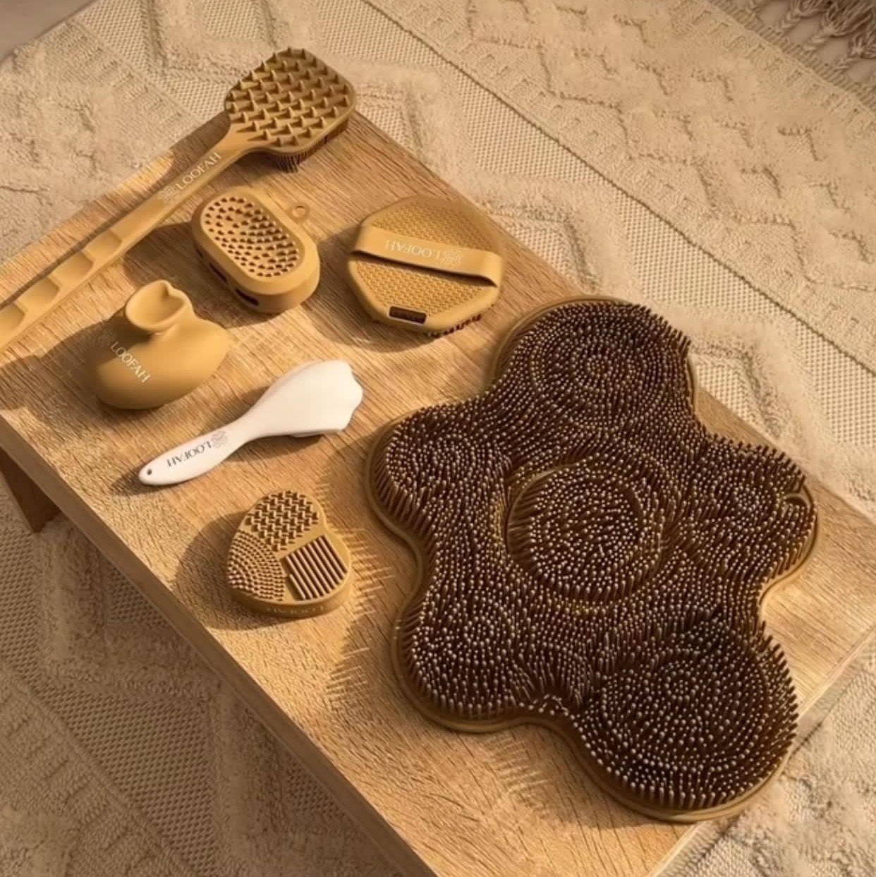 تظهر الصورة مجموعة متنوعة من منتجات اللوف. اللوف، الذي يكتب أيضا اللوف، هو إسفنج طبيعي مصنوع من الداخل الليفي للفاكهة الناضجة المجففة لنبات اللوف. غالبا ما تستخدم اللوف كإسفنجات حمام لتقشير البشرة. يساعد نسيجها الليفي على إزالة خلايا الجلد الميتة والأوساخ بلطف، مما يمكن أن يحسن الدورة الدموية ويحفز تجديد الخلايا. تعتبر اللوف بديلا أكثر ملاءمة للبيئة للإسفنج الصناعي. لتجنب تراكم البكتيريا، يوصى بترك اللوف يجف تماما بين الاستخدامات واستبداله كل ثلاثة إلى أربعة أسابيع.