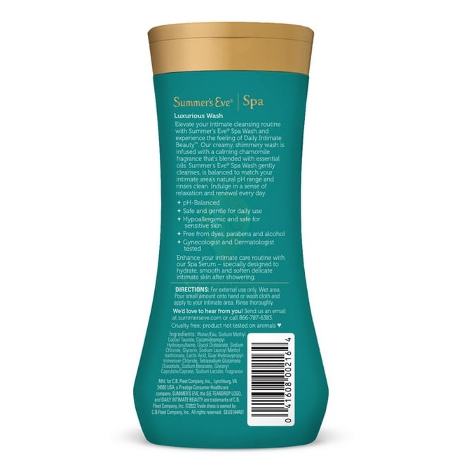 يحتوي على عطر البابونج المهدئ الممزوج بالزيوت الأساسية غسول الجسم الأنثوي الكريمي اللؤلؤي مضاد للحساسية وتم اختباره من قبل طبيب أمراض النساء وآمن للاستخدام اليومي ينظف ويترك البشرة تشعر بالتدليل تم تصميم الغسول الأنثوي المتوازن لدرجة الحموضة للبشرة الحساسة والحميمة وخال من الأصباغ والبارابين انغمس في تجربة مريحة ومتجددة كل يوم مع Summer's Eve Spa Luxurious Femine Cleansing Wash يحتوي على زجاجة واحدة من Summer's Eve Spa Daily Intimate Wash، 12 أوقية