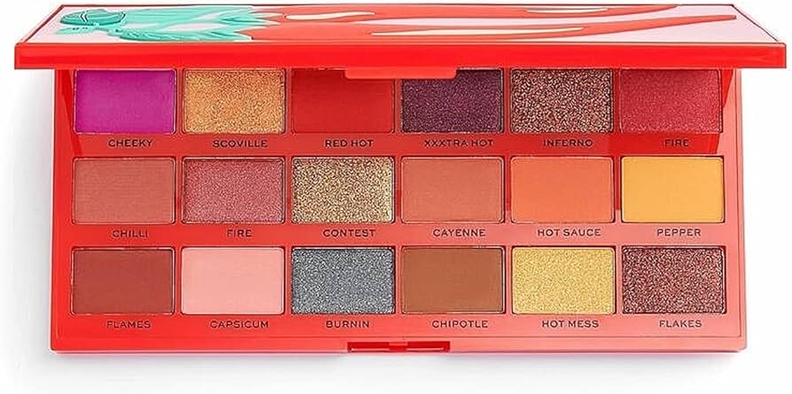 مجموعة من اللوحات التي تم اختبارها حسب الذوق؛ لوحة الفلفل الحار الأحمر مزين ب 18 لونا أحمر ساخن من Xxxtra Hot deep purple، gold Hot Mess، bronze shimmer Inferno، orange Hot Sauce وأكثر من ذلك! يتم تسليمها في صندوق الفلفل الحار الوردي والأحمر خالي من القسوة